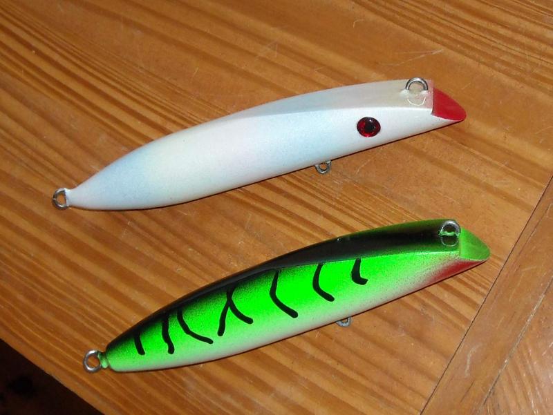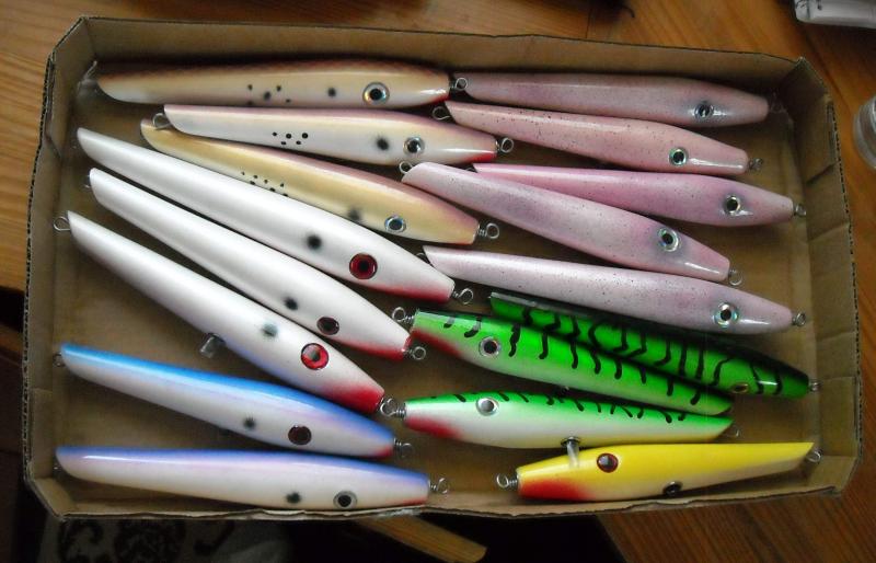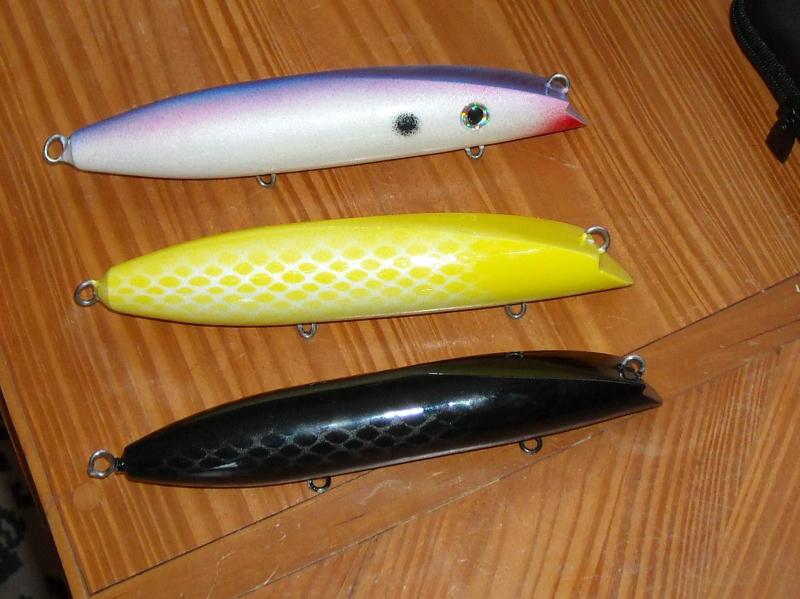 Here's a few needles that were leftover from needlefish month, there was a real nice black &silver one that got dropped, and that lone popper was part of an experiment from earlier in the year. I think the belly hook is too far forward on it but we'll see.