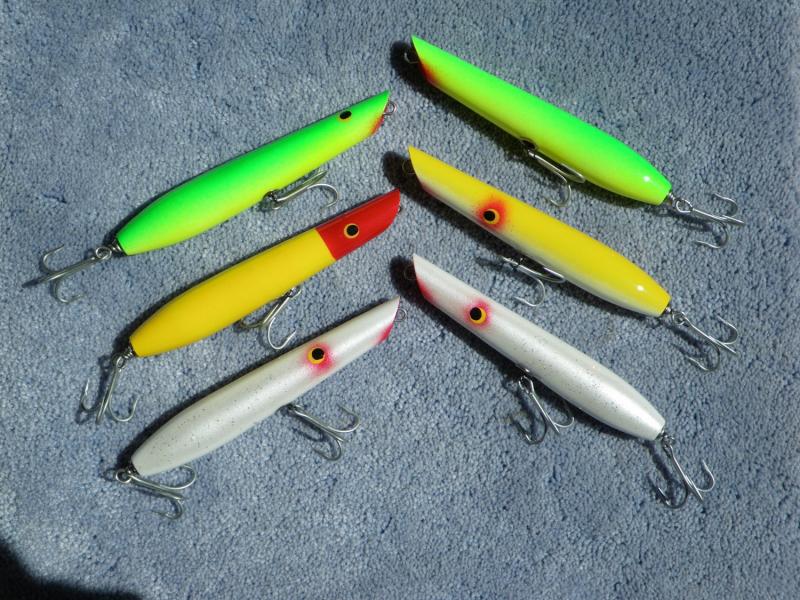 ....and some "dinner plugs". Copies of that beat up plug I posted earlier this winter........an attempt at a Jigman spook before I had a real one that worked well for a friend. Approximately 6.5" and 2.5 oz. They have a medium belly weight and medium tail weight to float at about 30 degrees.