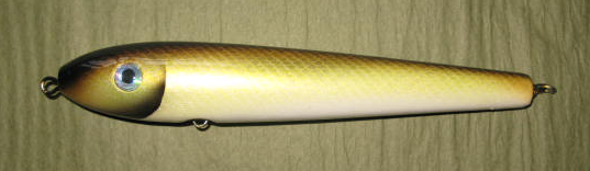 Haven't had a lot of time to do much lately. Seem to be living in two worlds. The old classics, like this pikie that's going to a buddy of mine in Rhode Island. He's going to use it at night in the breachway rips. I continue to experiment with the airbrush, refining how to use it, like with this 8" spook. Hope the bass like it.... And I continue to play with carving. The top one is 3 1/2" long and swims with a sweet tight wiggle between 2 and 4 feet down. The bottom one is pushing 5" and has a snakier action and swims about 2 feet down.