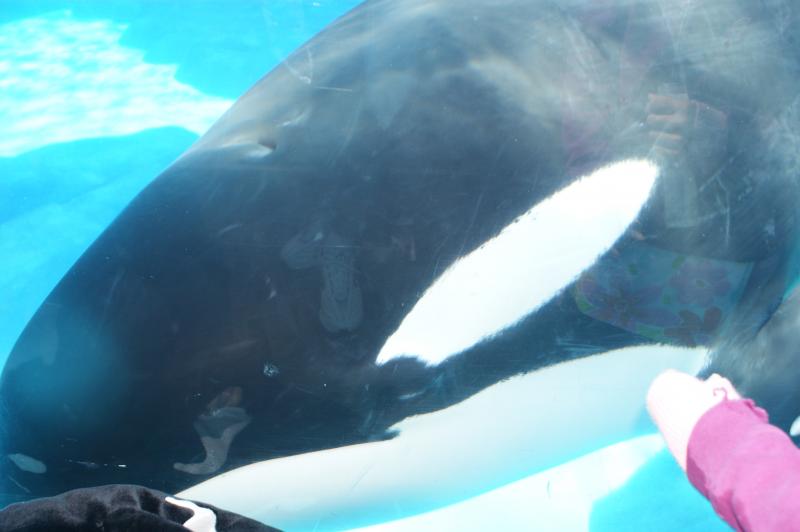 This whale was in a big tank behind the Shamu show. A woman who looked to be a pro photographer put her bag down, and then placed a 3' stuffed killerwhale on top of it. The result was the whale in the tank swimming straight at the window, and then siding up to it, getting eye to eye. It stayed there for a couple of minutes...