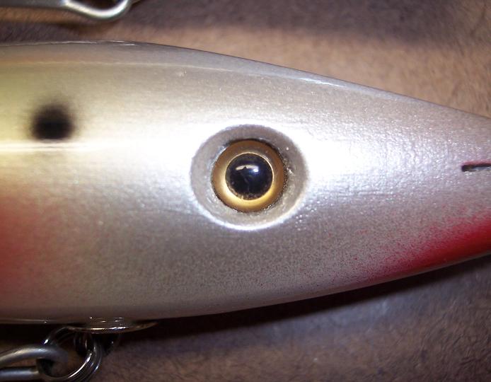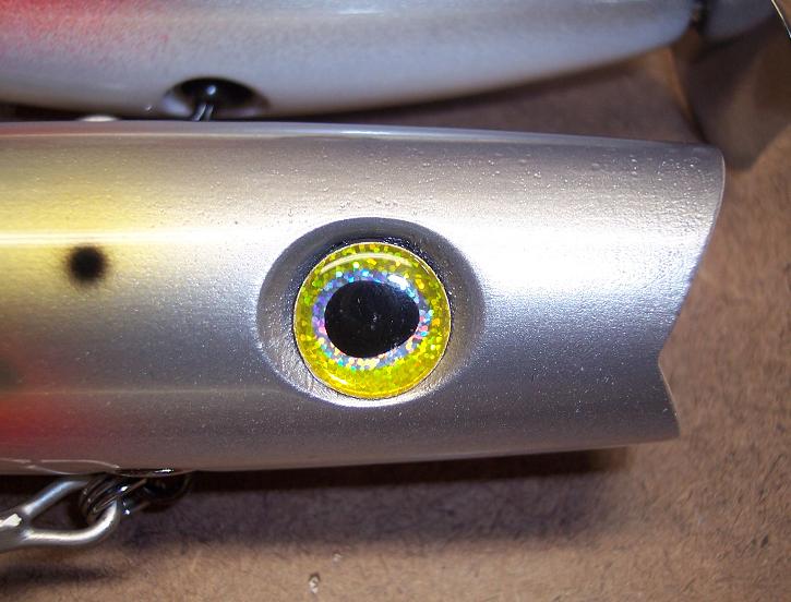 the rest I like a slightly recessed eye, I've found that glueing them in place rather than just sticking them on eliminates bubbles when you epoxy the plug..reason being, the trapped air behind the eye socket expands as the plug in my heated spinner revolves...