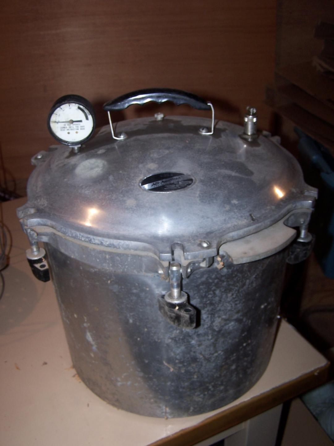 Also I have about a five gallon size pressure cooker that is about 30 years old. It is the kind with a pressure valve/guage on top with swing bolt that get pulled up over the side and tightened down.