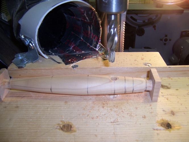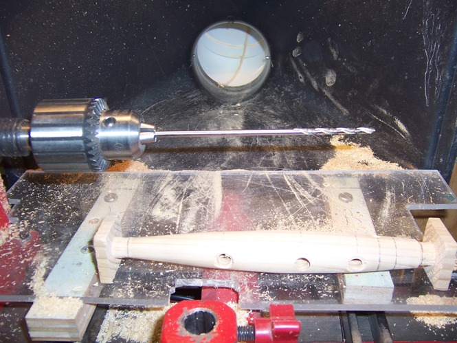through drilling.. this can be done on the lathe or drill press (if you have enough height) .. I'm useing the lathe ( speed set @1200 rpm) for this fitted with a 5/32 aircraft style bright finish drill bit, drilling from the tail end with the nose supported by the tail stock, hold the plug in your hand and slowly feed the plug into the drill by sliding the tail stock, revers direction often or any time you feel the drill binding or making noises.. you only want to drill to the front hole, if your drill is not long enough, dont worry, the job can be finished by hand when we drill from the front..