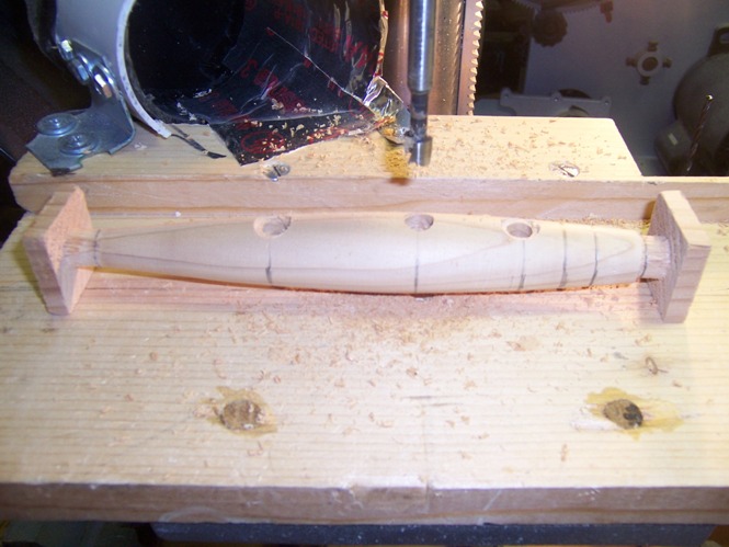 next step marking the eye... find ( or make) a block of wood the is just above center and draw a pencil line across the circle marked for the eye... use an awl to pilot the hole and use either a hand dril or the drill press with a 1/4 forshner bit to drill the eye socket about 1/16" deep,...