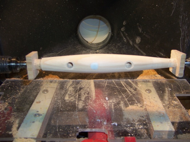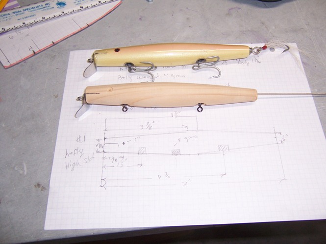 For me, it starts with a need... in this instance, the need was for a slim profile swimmer... the idea, like most idea, was not/is not new.. or mine originaly, in this case, Danny Pinkney inspired the idea long before me, I liked the profile ( although I've only seen it on line, never in person) ... so knowing roughly the size of the plug I needed, I spun several bodies out of scrap pine....dipped them in polycrylic to seal them for testing , rigged them using cheap galvinized wire and fitted each with a differant style lip... several holes were drilled in the bellies ( one was tail weighted), in differant location on each plug, each were weighted differantly, each hole ( un ocupied) was filled with modeling clay, which could easily removed to change size and location of weight... after swim testing, i settled on a profile I liked, copied it to a template so I could run them on the duplicator and repeated the process again using WRC.AYC and Birch.... after several trial and errors, i settled on the design i now have, using WRC and the weighting scheme...