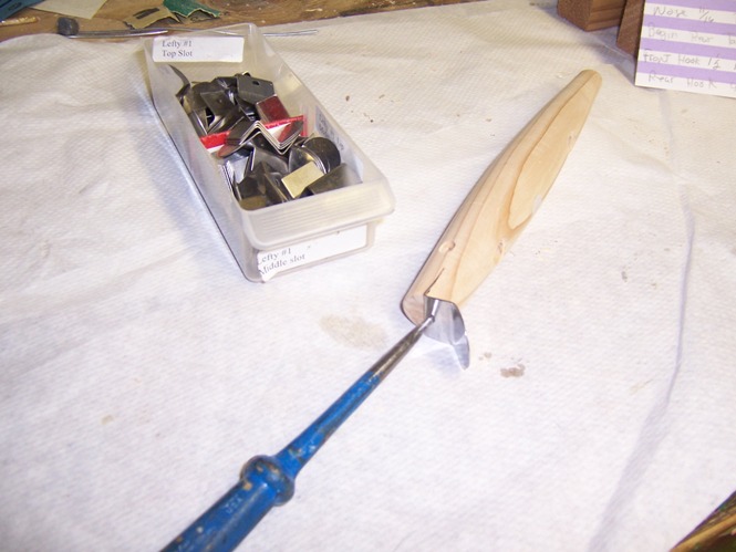 now slide a #1 lefty high slot into the lip slot, center it and lark it with an awl...remove the lip and using a hand drill. drill at an upward angle into the front hole, you want to be as near the top of the hole ( as if the plug were belly down) as possible, this will keep the #1 swivel from hanging down too low.. if your drill did not reach the front hole, now is the time to connect it... test fit all your parts...if all is fitting properly, lighly sand the plugs ( with the grain) with #320 to remove finger prints and any lingering roughness, lightly round the edges around the nose and tail , this will help paint and top coat to adhere to the plug...dip in your chosen sealer and paint them up..