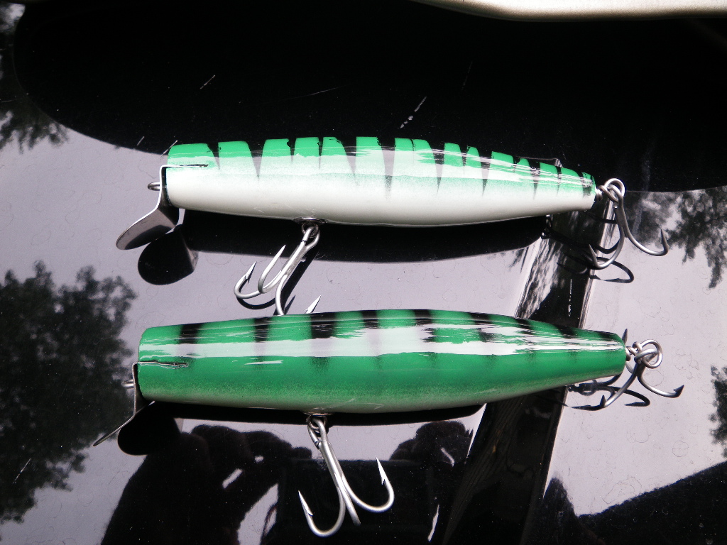 Been going at it pretty good lately...fishing time has been limited(wife's fault  ) so I've been down in the cave making plugs...some good stuff to follow... these are a couple musso pine jr's I just finished: