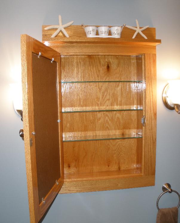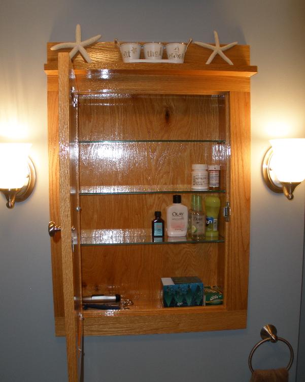 Our bathroom renovation is now officially complete with the addition of a custom built in medicine cabinet! Oak with satin nickel hardware to match the rest of the bathrooms hardware......1/4" glass shelves! I am very pleased with the final results! Not bad for my first cabinet! There are a few things I would do different next time but it looks fabulous! Special thanks to Slipknot for his help rabbiting the door! Bruce.....I screwed that door up and had to build another one!