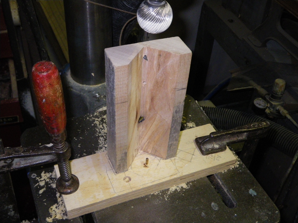 The next step is to cut the face. To do this I use a drill press and a salty ball (rotary rasp). As you cut the face it will generate a lot of downward pressure on the plug and rotary force as well. Holding it in your hand is ill-advised, so I made a jig. Just a board with a vertical V block screwed to it. At the base there is a 1/8" pin that I can set the tail hole on. Take a compass and draw a circle centered on this pin that is the same radius as your plug's at the max diameter ( which is 2x the radius for Back Beach's benefit), then position the walls of your V block against this circle and fasten it down.