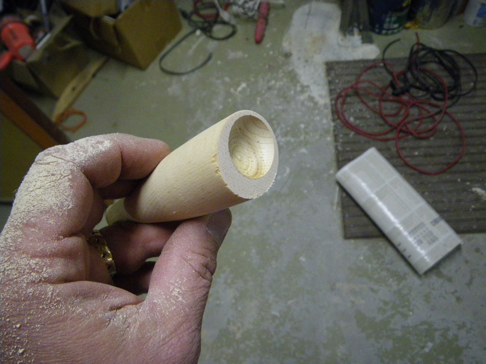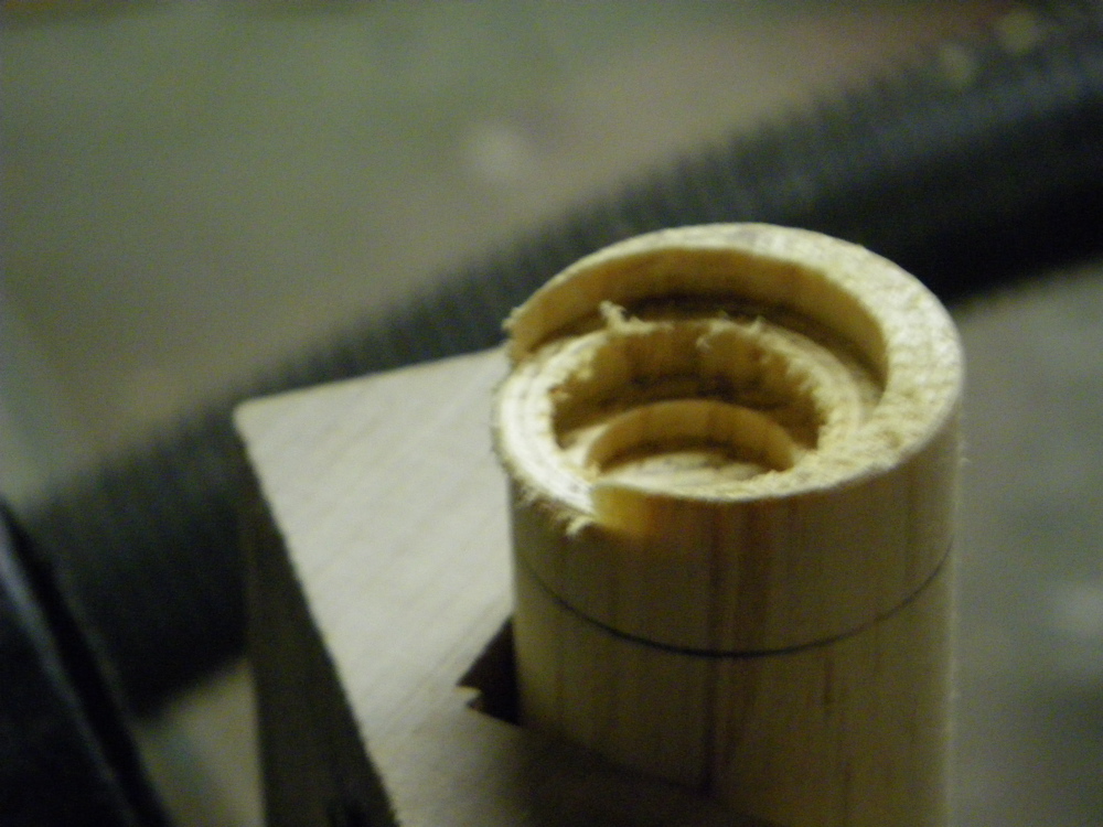 The next step is not immediately obvious, but you don't want to drill/cut on center. This is because when you cut the slant on the plug, it will cut through a sphere and the lower lip will end up thicker than the top (see the first photo). With the Blue Streak it is even more important because the original has an off center cup (the top is thicker than the lower rim). To accomplish this you want to drill/cut off center and closer to the lower rim (see the second photo). How much takes some experiment, for this plug about 3/16" worked well.