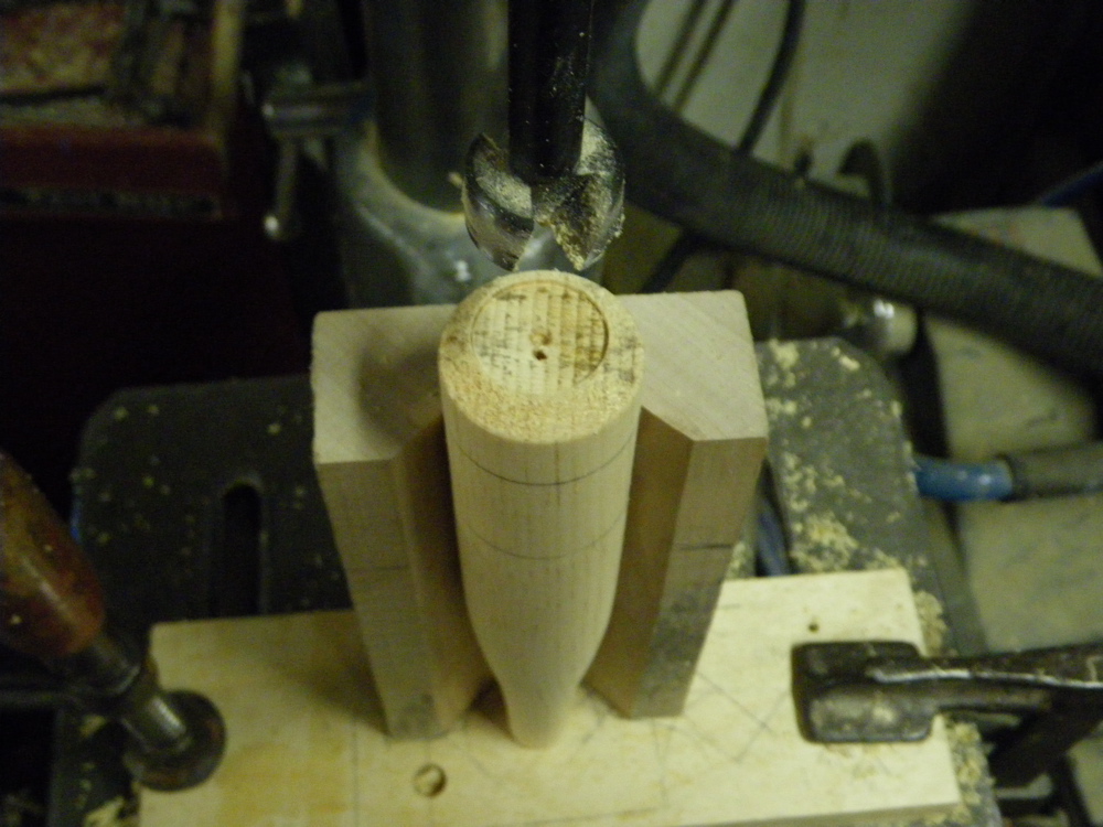 Look closely at the picture and you'll see two things that help. First I use a smaller V block that I can slide under the tail to level the plug. Second I use a square against the slant of the face to be sure the apex of the slant will end up aligned with the belly hole (if you rotate the plug against the square edge the slant moves away on one side.....when both sides touch you are aligned).