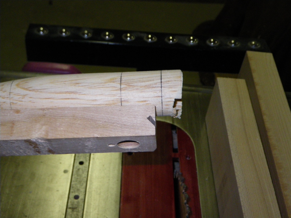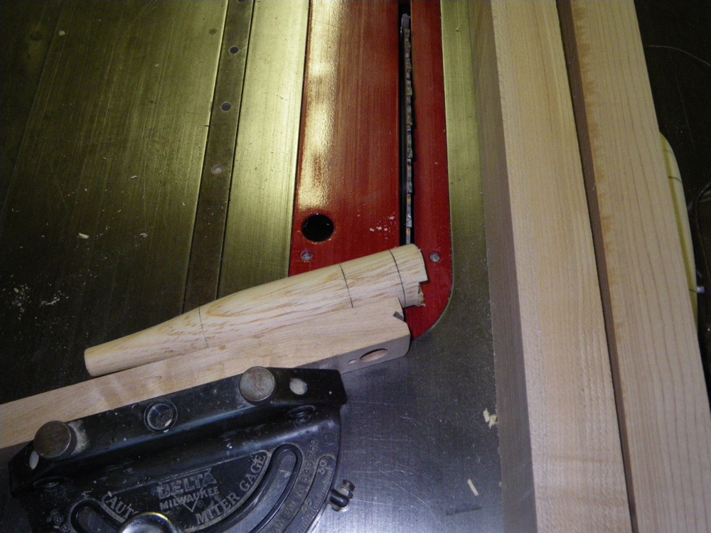 Next to the table saw to cut the slant. To keep things level I screw the plug to a board, through a hole 1/2 the diameter of the plug from the edge of the board. Then a pass through the saw with the miter gauge at 73 degrees. And then presto the end result.