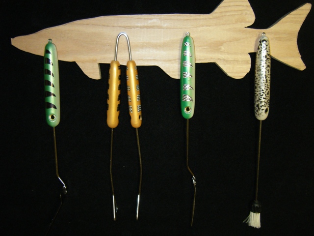 I'm almost finished with my Father-in-law's custom plug BBQ set X-mas present. I wanted to post my progress knowing I wouldn't be able to post the completed project before the holidays (traveling). I'll finish up tomorrow by sanding and staining the Musky plaque I designed that the utensils will hang from (using leaders and mock treble hooks. They look better in hand, I can't take a good picture to save my life
