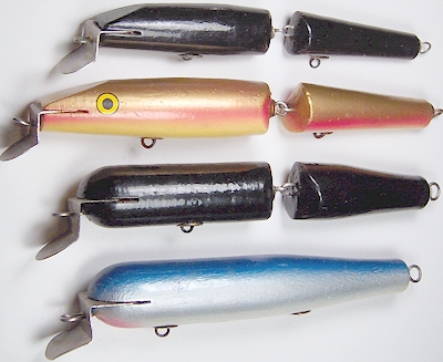"Danny's Jointed Junior (third in photo) bore a similarity to Danny's Junior swimmer (bottom). Other traditional jointed eels (top and second) were slender-bodied and effective mainly in slow-moving water or gentle surf. Danny's Jointed Junior was not typical of other jointed eels in that Danny's Jointed Junior was wider-bodied and more robust to handle moderate surf and stronger flows (although the Jointed Junior also had its limitations).