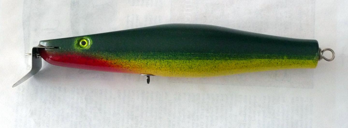 I decided to make this in AYC and rattle can paint it Hunter Green with Rusto Yellow belly and Rusto Red chin. It has one belly wt just aft of the belly hook position