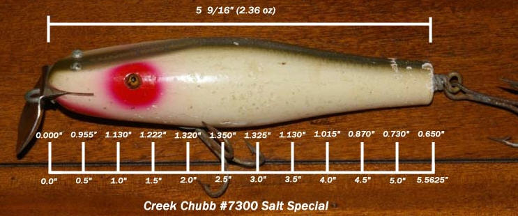 here are measurements taken from an original CC 7300 salt Special in 0.5 inch increments. The center of balance in an unweighted plug is 3 inches back from the nose. If you want to add wt this is the location to drill your belly hole.