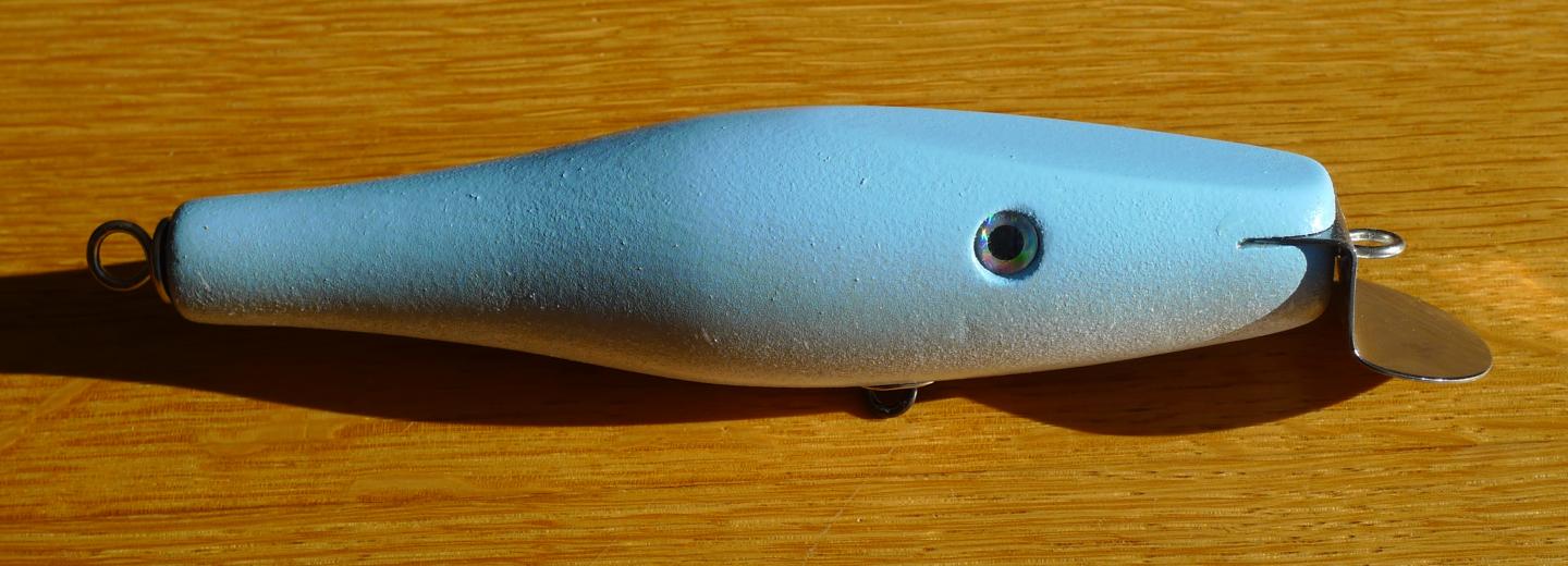 A couple more 7300 and 7400 reproductions with Rusto light blue, machine gray sides and white belly on smaller plug. The body shapes have the "hips" more forward to improve the wiggle compared to the ones I made last week The smaller plug has a Pikie 2 while the big brother has a Pikie 3...