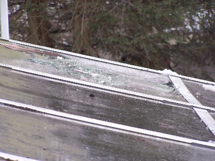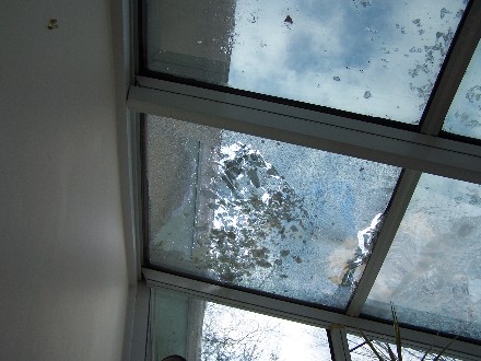 Yesterday most of the remaining ice dam came down on the 4 season room and only caused one leak. Today what remained came down and shattered one panel and we have a new leak