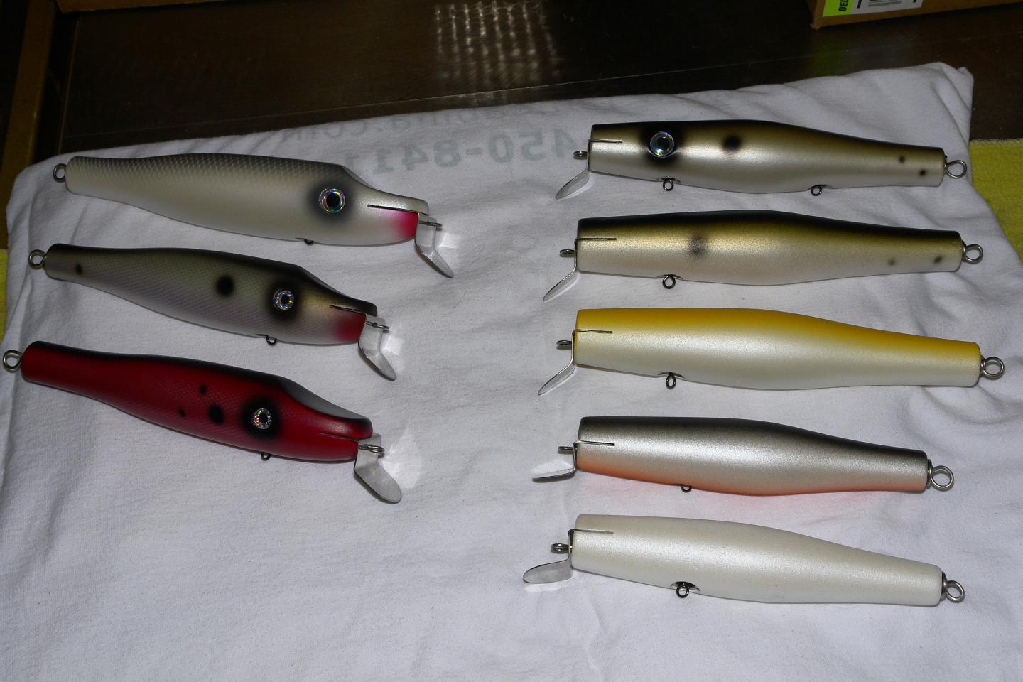 Here's a few big divers I did to get away from turning baseball bats. I needed a little no brainer R & R. They weigh in 4.0-4.7oz. Slope heads are shallow divers and the dish nose is a medium to deep. The deep divers have an additional weight 3 gr. in the chin w/ #6 screws 2 gr. into lip.