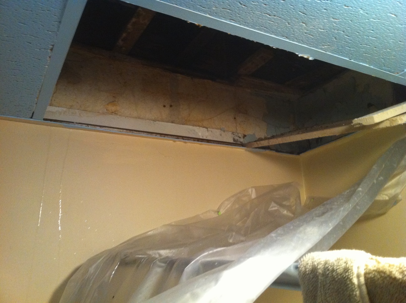 so after a nice 10 hour day of working in the kitchen i went over my girls house to find that bathroom ceiling was dripping right onto the toilet and cabinet.