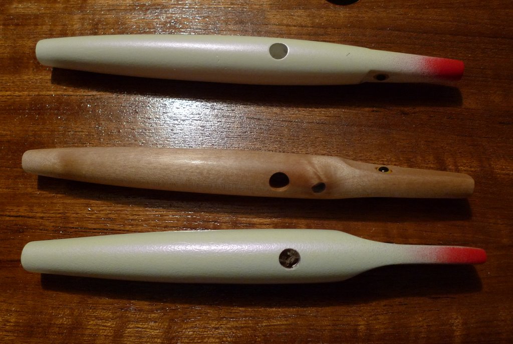 I followed the KISS principle and painted everything pearl white with chin splash red except for one natural needle... this is the 1st time I tried the choopy shape for my needles... I have always been partial to the musso style... the fish will help me decide which i prefer for 1st light fishing in a few spots I fish...