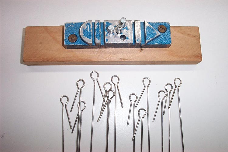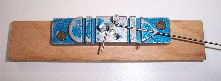This is very simple to make and your loops will come out perfect every time and they can be made in about 20 -30 seconds each. Pic 01 shows the jig, all you need are the three holes that have the pins in them and one saw kerf with a handsaw. Take a piece of 3/4" hardwood and cut it so it's 1" wide. You can scew it to a workbench or clamp it in a vice which is what I do. The pins are pieces if 1/4" steel rod 1" long. The holes are two in a straight line and the end one at a 45 degree angle up. The holes have 1/16" between the edges so if you do the math, 5/16" between centers when you mark out the holes.Make the holes 1/2" deep. Next to the holes make a saw kerf that your wire will fit into so you can make the initial 90 degree bend nice and neat. Lay the wire the full width of the wood so you'll have an inch of wire before the bend. Now just follow the pictures, in the last picture I tighten up the loop by squeezing the ends together with a pair of pliers. ...mrpogie