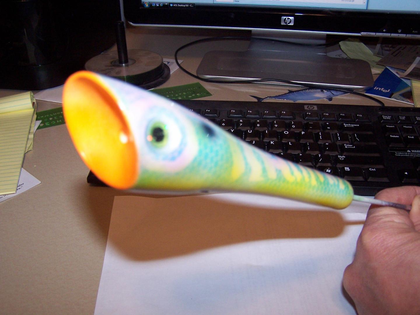 The angle of the head cut is 10 degrees more than on a regular CP, because I wasn't paying attention. I tested it before painting and it work as well as the standard cp head cut, only it sat slight lowere in the water. So I thought the popper deserved a different paint job than what is seen regularly on CP's. This is done I guess you could say negative using frisket.