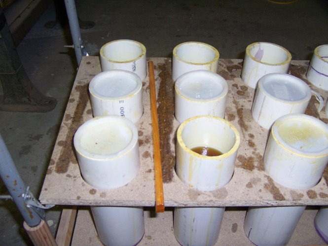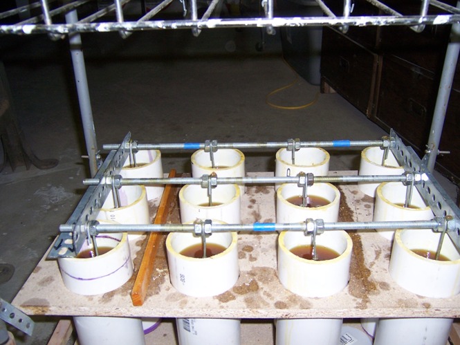 Now I use 3" PVC capped off on the bottom as i recall, they are 14" high ( not sure on this as i built them a few yeqrs ago)... each tube is set into a retainer and can be removed, so I can periodicaly strain the solution through a paint strainer and add more liquid if needed ( I fill to the heightof the retainer board)..