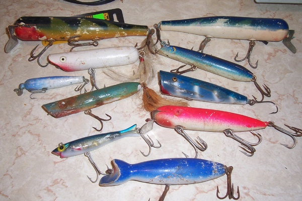 Left side from top-Atom 51,Danny plastic popper,Atom jr jr,M+M popper with screw eyes,not sure of next then a gibbs polaris. Right side another Atom 51,Gibbs darter,Creek Chub popper,Conn Yankee swimmer,Bottom still a Polaris LOL Been lookin in some books for the second from bottom on left can't find it. Snook bait also made a swimmer like one on right. Ron