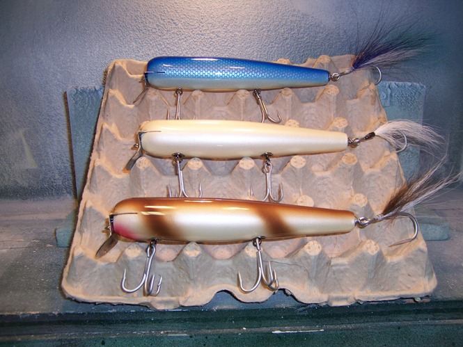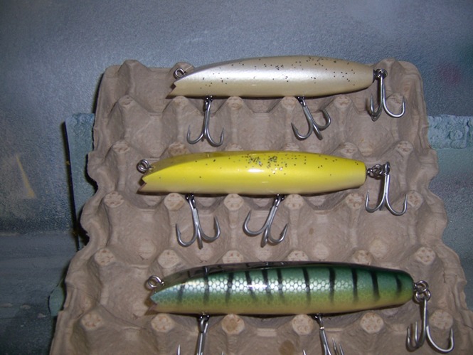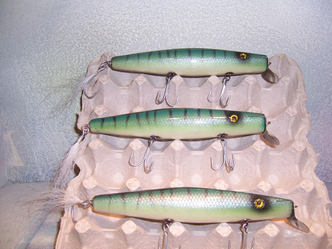 First pictures are of full sized goo-goo's 8" long... through wired.. 3 ounces made from WRC... I actualy turned these last summer as i ran short on supply.. i just got around to putting hooks on these now..... I'll be making more..( one with black body gold scale and white eye shadow for Salty dogs name on it)