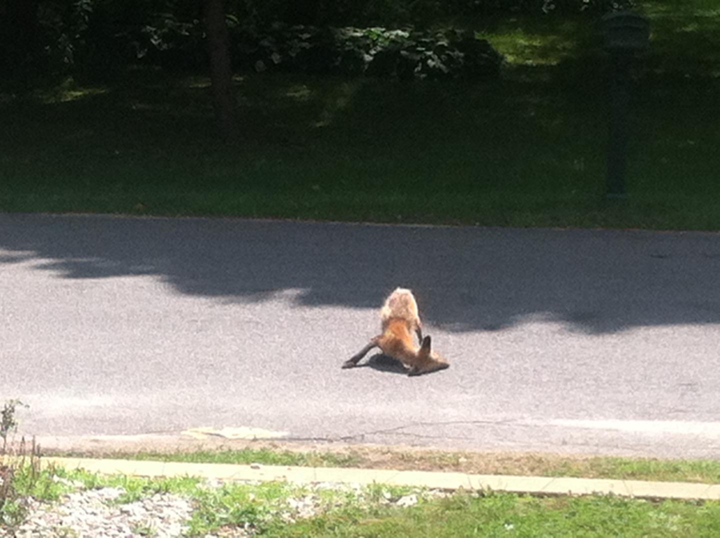 that fox has the mainge... also callled scabbies... it is parasite driven and usual kills them...that is the reason it is scratching on the road... the poor thing is in agoany..it will be best to put it down... hopefully it does not die under you crawl space..