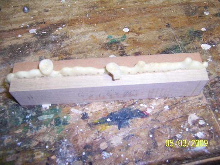 Once the "V" cuts are finished, a hole is drilled in the lower half of the front section for your belly weight, in my case, I drilled a 15/64 hole 1 1/8" deep to accomodate the 4 grams of lead, the weight was then installed and the hole sealed with elmers 2 part epoxy, wood repair putty, I also use the 5 minute 2 part putty made by lock tite, it comes in a tube and you slice off a chunk, mix it up and it's good to go in just a few minutes, I use this when I'm only doing a few pugs, for big jobs, and an extended working time, I use the elmers...