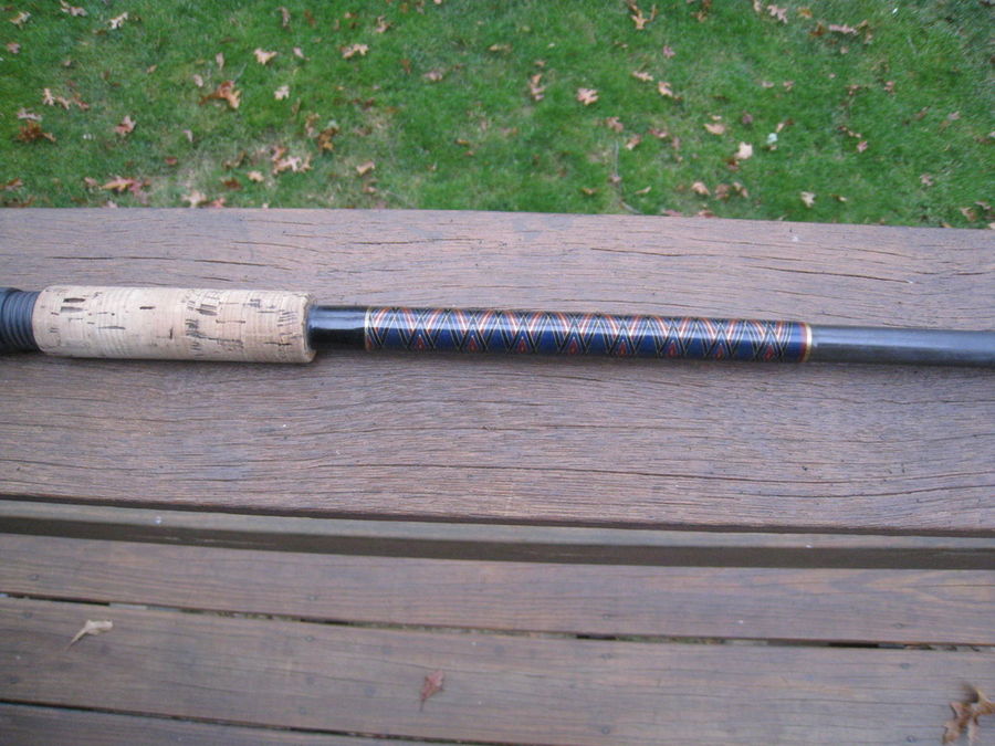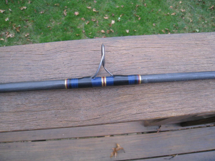 J. K. Fisher is 10'4" total length. It's wrapped conventional, rated 2 to 6oz...w/8 Fuji sic guides, AAA ring cork handle, graphite Fuji trigger reel seat. It was re-wrapped/re-built and extended by Mike at M&D Tackle near the Ditch. The cork butt, guides and wraps are all in good shape. The blank is good. The only minus is that the glossy finish coat on the blank is about gone. $195.00 picked up in SoCo, RI. REDUCED TO $175