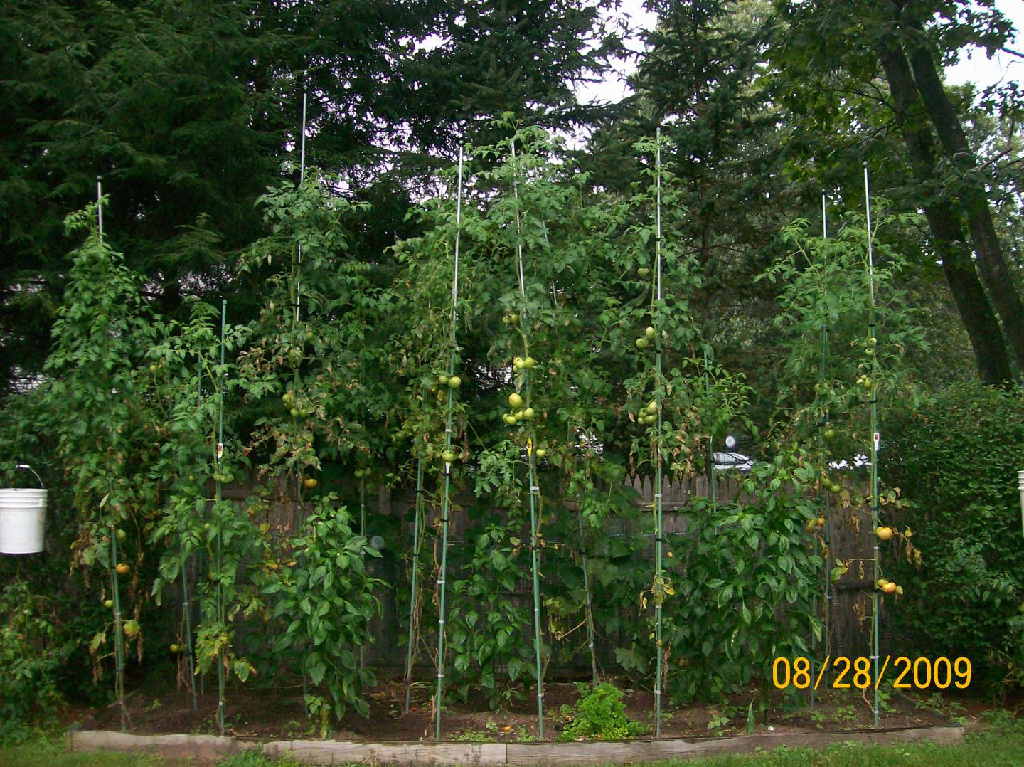 I just visited c. N. Snith farm right around the corner from my house. In one of the hot houses they about 200 tomato plants in five ga.llon buckets. They had a reel system attached to each plant. The higher the plant grows the more the spring loaded reel retracts. Too expensive for us to use. My garden is all planted as of today