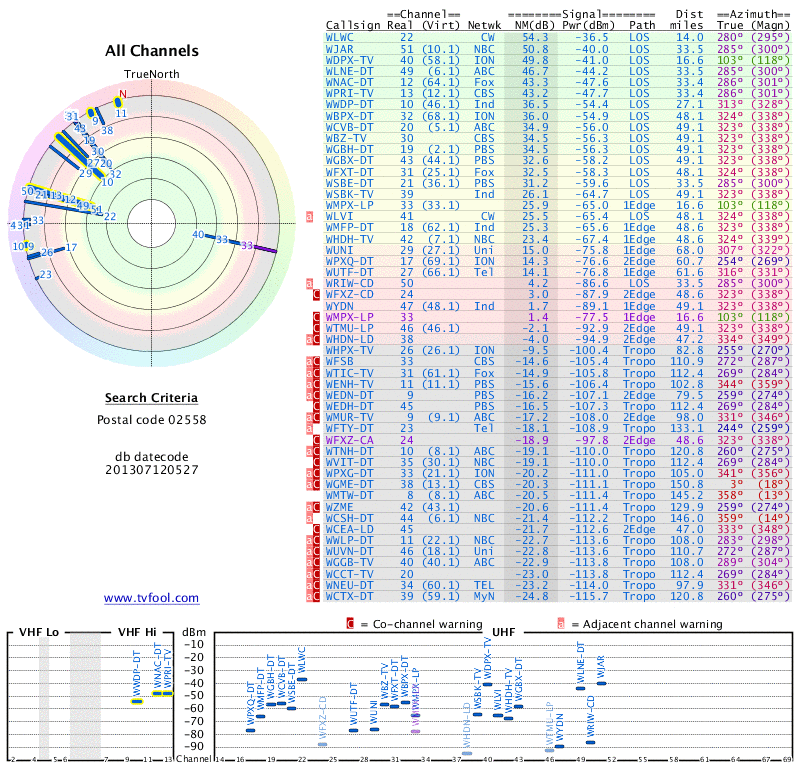Here's a list from TVfool.com showing what channels should be available in Onset. The channels are listed by predicted signal strength so the higher up on the list the better chance you should have to receive it. Also there's really no such thing as an "HDTV antenna", that's pure marketing. The frequencies you need to receive are the same as in the olden days. Most are UHF but there's still some VHF as well. If you look at the channel list I posted below anything with a "real channel" shown of 13 or below is VHF. I didn't look at the link for your particular antenna, but it's common for antennas marketed as HDTV versions to be UHF only. Your strongest signal Fox and CBS channels from Onset are VHF.