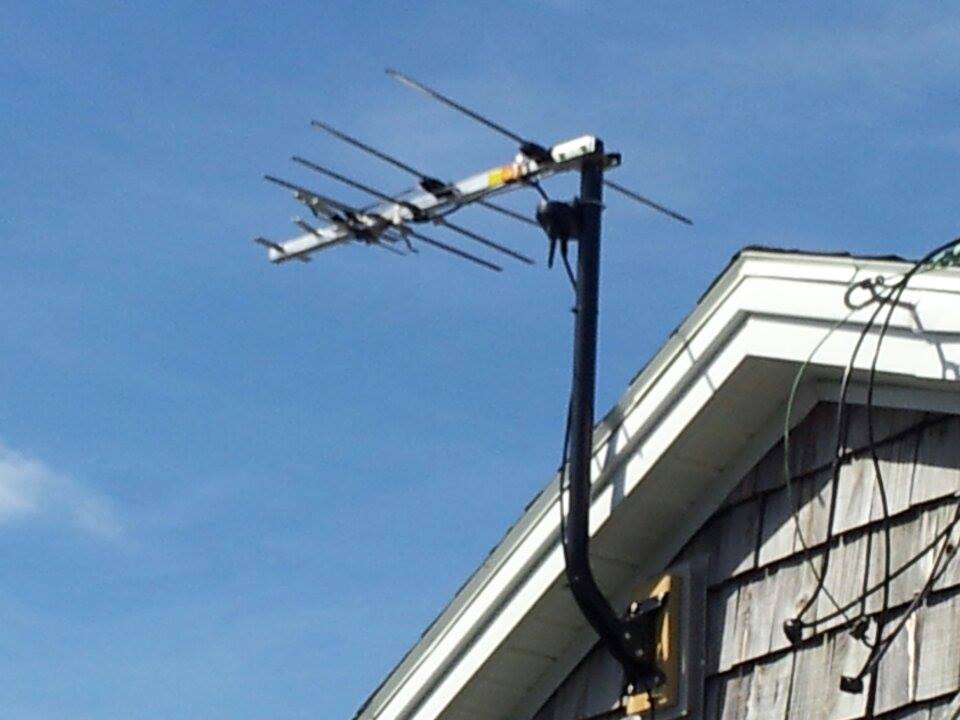 Radio shack antenna on the roof and a digital converter box