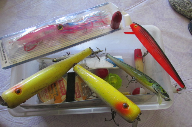 I waited a while & then asked the owner what he wanted for the two wooden yellow plugs . he said lets go see . he said how about $15 for box . SOLD ,just the sinkers must be worth $5