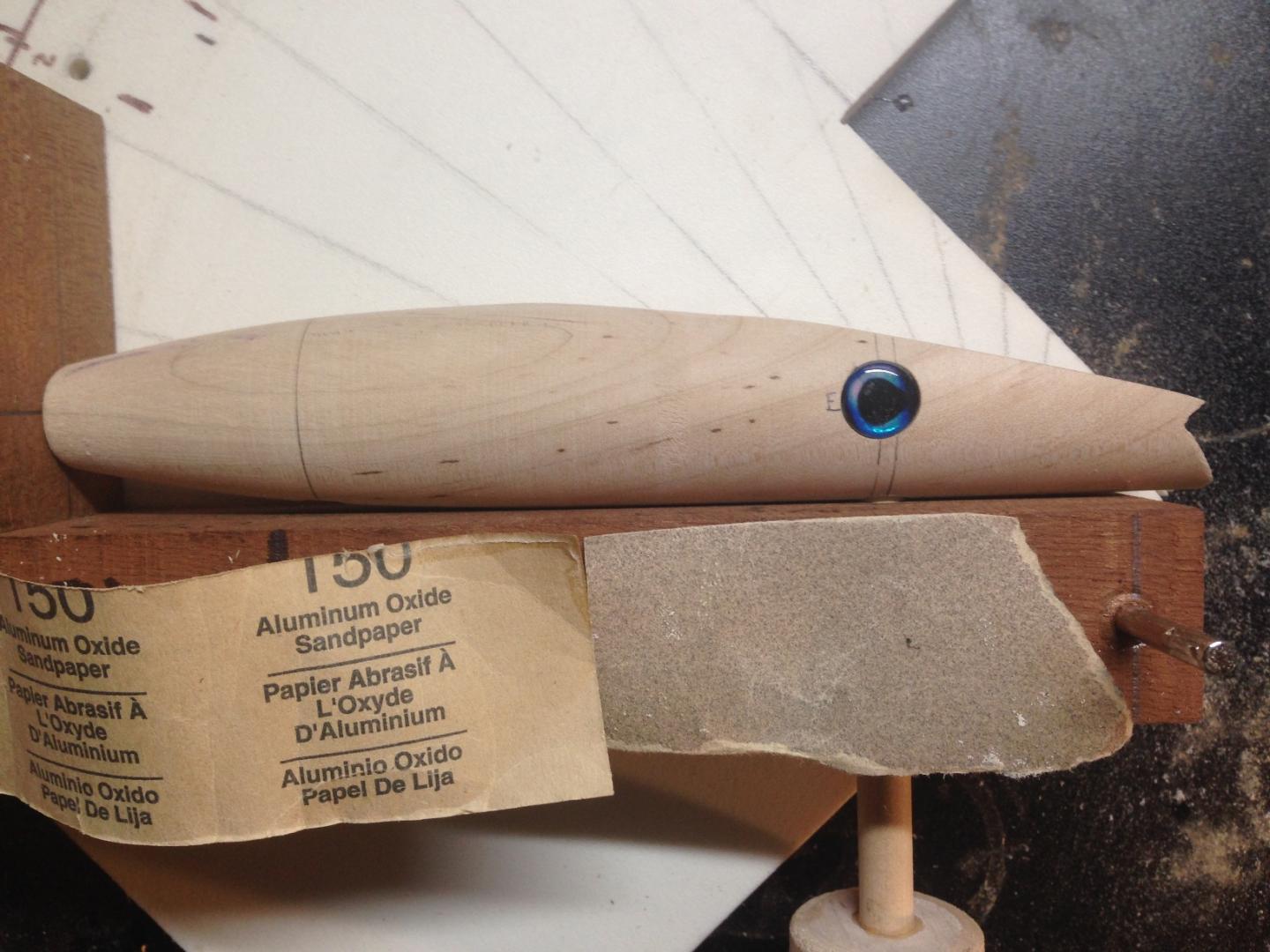 The first body I turned, I used the front and rear center holes on the wood stock to drill my thru hole, belly holes, and eye holes. I know the dimensions from the tail, but need to make sure they are parrellel and perpendicular (eyes)