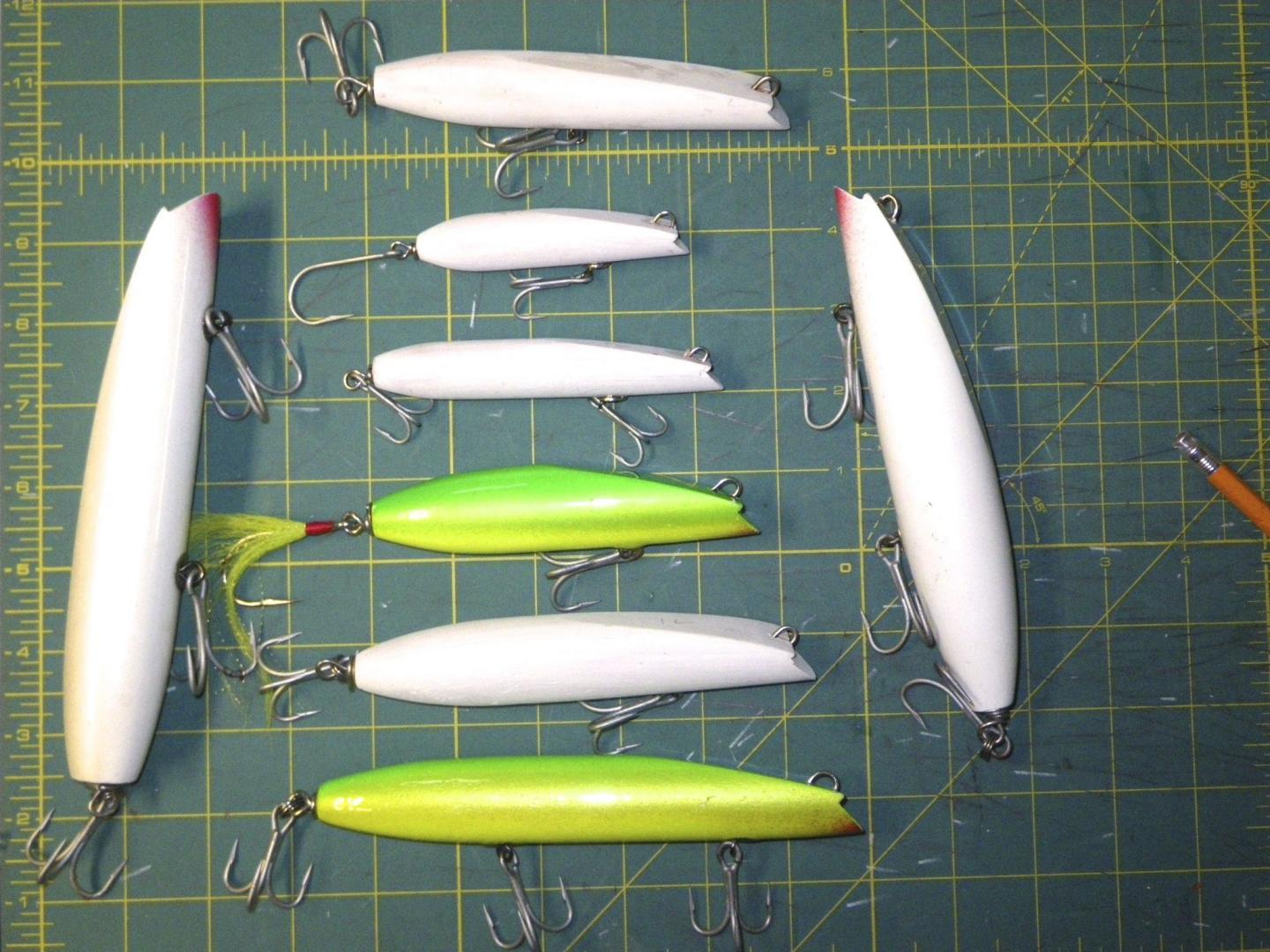 The plug on the left is a Pinchney clone, the top plug a small Gibbs clone (itself a very good plug), the rest are variuos musso's. The plug on the right is the one you want.........and if I could only have one plug to fish at night that is the plug I'd choose without regret. In yellow or parrot.....although purple is also real good.