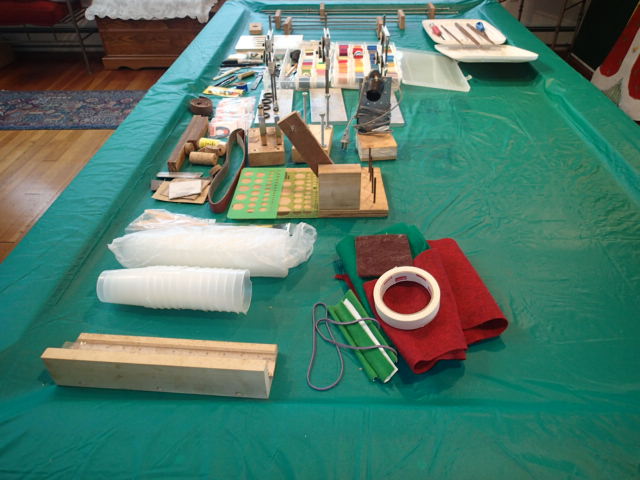 Time for someone else to enjoy the process, to purchase, have made or make yourself all this stuff I estimate between $500-$600, so I'm going to price this at $275. I had some tooling done as you can see, I really didn't like the fiberglass reaming kits, the heat was an issue, so I had tapered reamers made, along with a tapered chuck I'd use to attached the rod but to a drill (with fiber re-inforced tape), that with handle clamps I made and the three supports and it was a quick and painless process to glue up and sand down handles. The drill mount that came from my old shop is there, drying motor, thread tensioner, boxes of thread, all the tools needed for putting on guides or making decorative butt wraps. I have Dale Clemons book on decorative butt wraps and step by step patterns of any wraps I've personally made. I'm going to post a few pictures here and will respond and post the balance.
