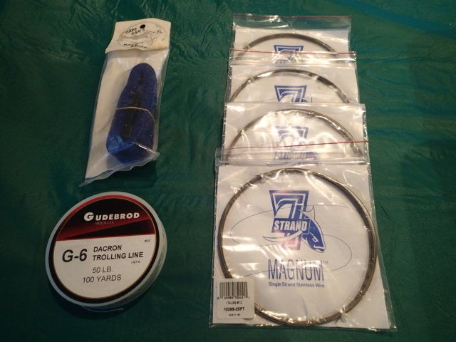 4 packages of 174lb#12 7 Strand Magnum single strand rigging wire and one full never used spool of G-6 Dacron 50lb trolling line at 100 yard, looking for $15 and throw in the Cape Sam's Bass Strap.