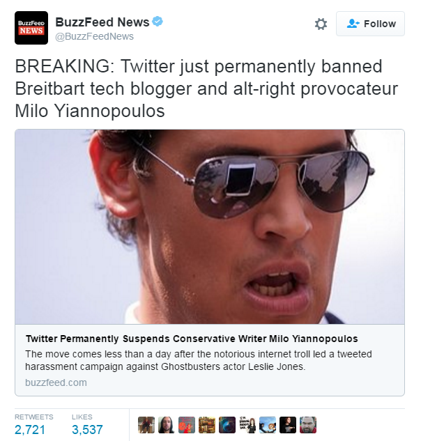 Two - Milo is repeatedly censored, twitter blocked, and run out of college campuses as a racist and hate monger that invades SJW's safe spaces.