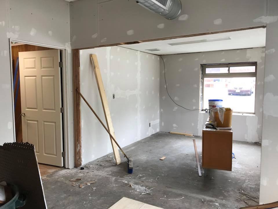 This building was an old Napa auto parts building and before that it was a car dealership. took down a wall, and are drywalling over 1960's knotty pine and also framing in strips, half inch plywood and sheetwrocking over a few cinder block walls... next steps are to paint the walls and ceiling, then instal a floating laminate floor and LED track lighting.