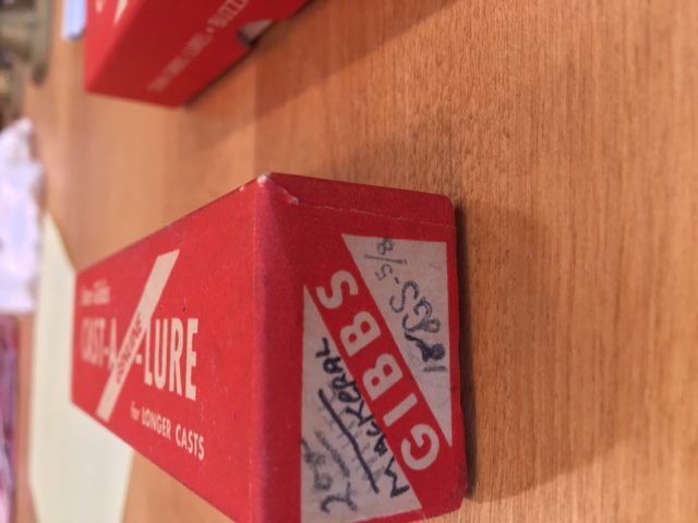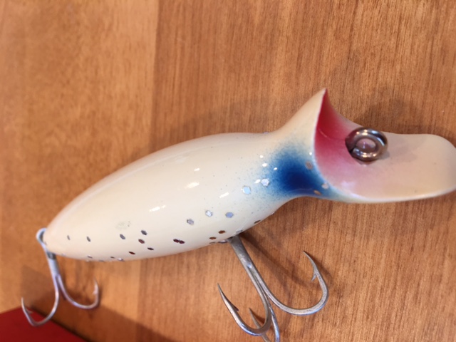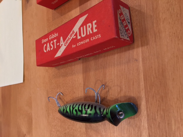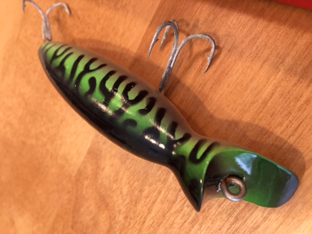 4", Green Mackerel - mint condition. Comes with box, not sure if original. You can see the white has been crossed out and "mackeral" has been written in. I've been told that there were mistakes with labeling when these plugs were being produced, but I'm not completely sure $40 shipped.