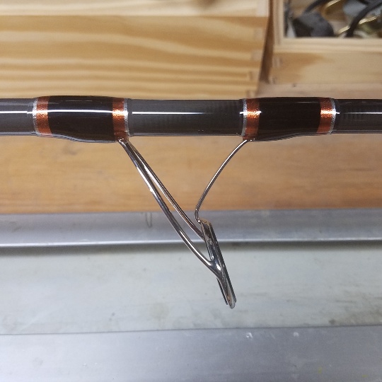 Lightweight designed surf rod to match reels up to 2 1/2" spool size.i.e VS 200. Fugi K frame guides Rapid Choke modified layout. Double foot KW30 stripper with KL single foot guides to tip. Individual feet double wrap, cooper/black overwrap. Fuji ergonomic reel seat. Reel stem distance to butt 24 1/2". Integrated cork foregrip transition from modified reel seat. Rear butt is spiral wrapped covered shrink wrap.