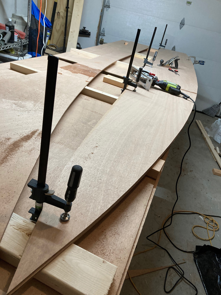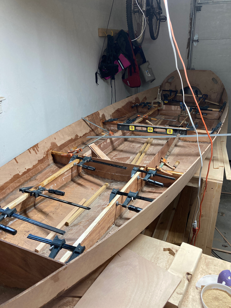 Going slow, i just faired the tops of the stringers this weekend and finished giving any bare wood a coat of epoxy. I'll bring the boat inside the house the next couple days and pour the foam inside the house, then bring it back outside to the garage to shave it. I can't get my garage nearly warm enough to pour the foam.