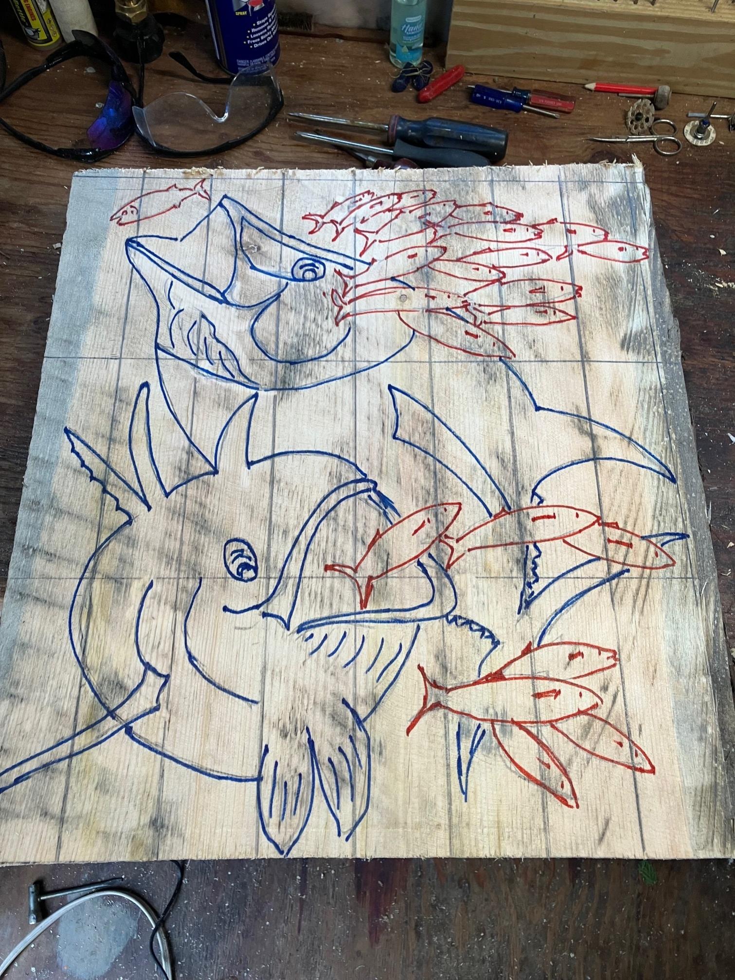Have two identical 3" thick planks prepared for what I hope will be a very cool tuna feeding wall sculpture for someone down the road. Anyone care to guess the artist I choose to use as a template for this piece? Not a huge piece in order to get the scale correct with the 18" wide plank I had left over, hence two duplicate 20" x 18" pieces. Probably will be a mix of hand and power chisel, which will give me something to do should we get a stretch of snow.