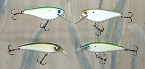 Some hand carves. Around 4 inches long. Wide ones are around .9 oz, thinner ones around 3/4 oz. Lexan lips on both. Wide ones will slow wake on the surface or dig about 4 feet. The other ones dig around 4 feet. Both have a nice wobble to them. Gizzard Shad patterns for the local Hybrids