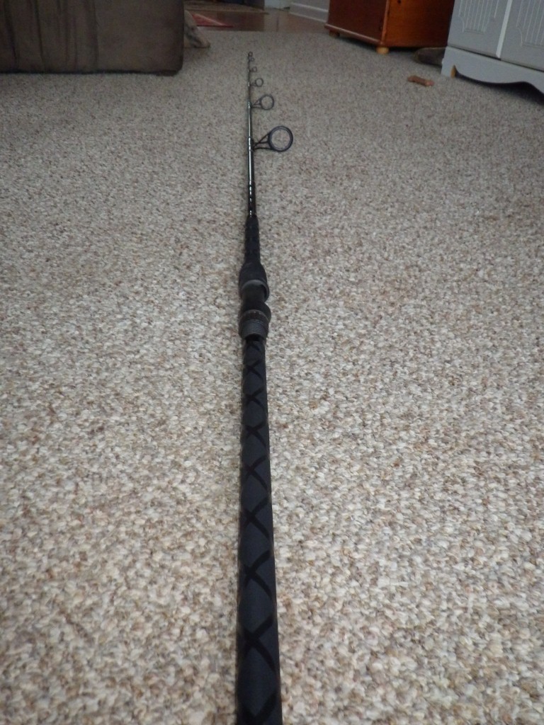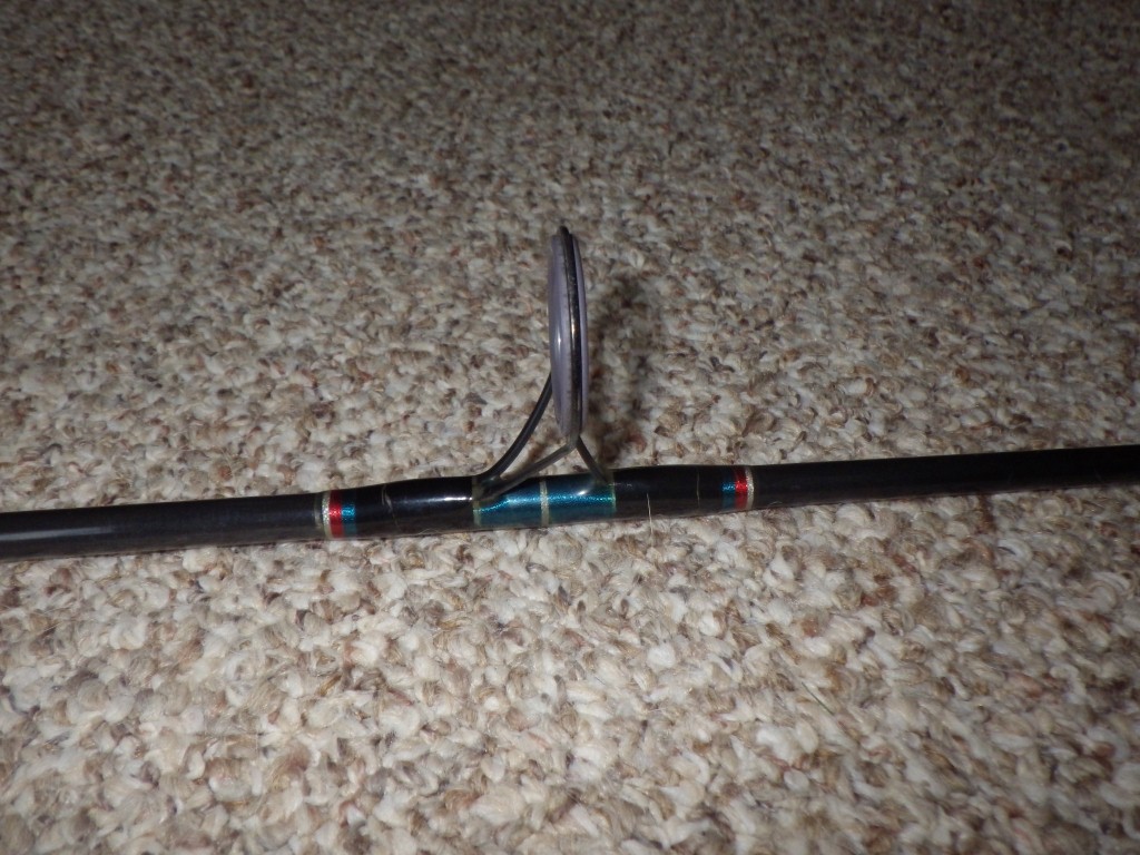 Wrapped in 2006 or 2007, COF with 50 collector, recent X-Flock over cork tape and Fuji DPSH reel seat replacement on grips/reel seat. Metallic red/blue/silver and black threads with diamond under collector guide and diamond buttwrap above fore grip (admittedly not my best wrap on the buttwrap but it has zero effect on the rod performance). This is a great rod that has bested many bass to 38 pounds in the surf for me from CT to Cuttyhunk. The rod throws an amazingly wide range of lures and eels. It is my go-to spring river rod. Only reason I am getting rid of it is because I plan to build another one and don't need two. Looking to get $200 obo. Can post some pics if there is interest.