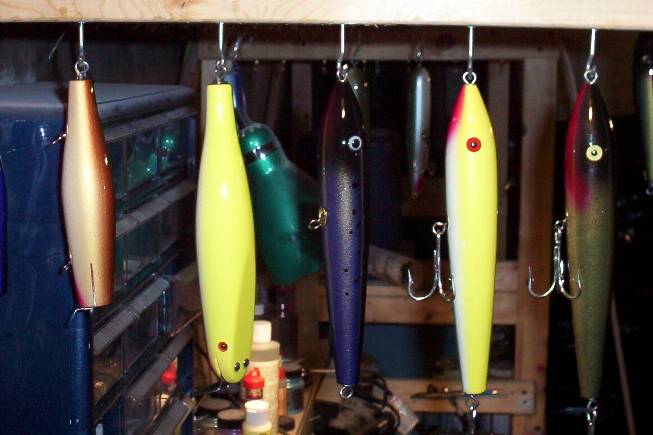 been fishin the 3"er's [spook type]sence I was 14 years old..blue tops,silver sides an yellow bottom...reel bass catchen colors..the big one has been sittin on the shelf collectin dust for a lonnng time. thought it was time to finnish it.